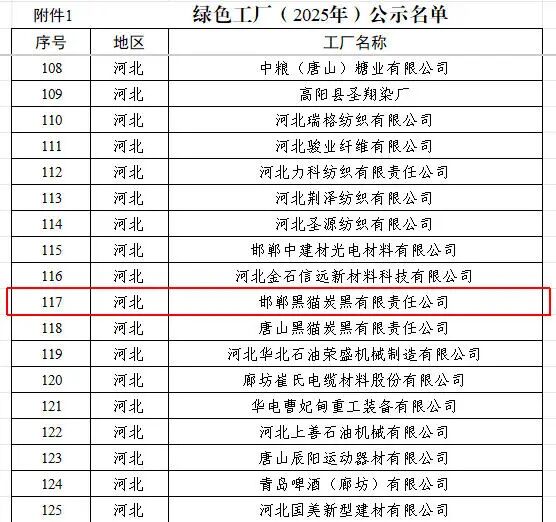 邯郸黑猫公示名单 邯郸黑猫依托母公司核心技术,打造“炭黑生产—尾气发电—蒸汽回用”三位一体循环模式,持续推进废气超低排放、废水循环回用等环保升级工程,构建全过程低碳管理体系。同时,公司深度融入地方循环化工产业集群,与周边企业共建“煤焦油—炭黑—热力”跨产业协作网络,实现原料本地化配套、生产洁净化管控、能源园区化共享,走出经济效益与环境效益协同提升的特色路径。 济宁黑猫公示名单 济宁黑猫严格遵循《绿色工厂评价通则》国家标准,通过优化生产工艺、推动节能技改、规范固废危废管理等核心举措,实现生产过程标准化、智能化、绿色化,有效降低碳排放与资源消耗,为制造业低碳转型探索出可复制、可持续的实践范本。 此次两家公司同时获评国家级绿色工厂,是国家层面对黑猫股份全域推进绿色发展成果的权威认可。面向未来,黑猫股份将紧扣“十五五”绿色发展规划与“双碳”目标,持续深化全链条节能降碳改造,拓展产业协同深度,以绿色智造赋能高质量发展,全力打造国际炭黑行业领军品牌。