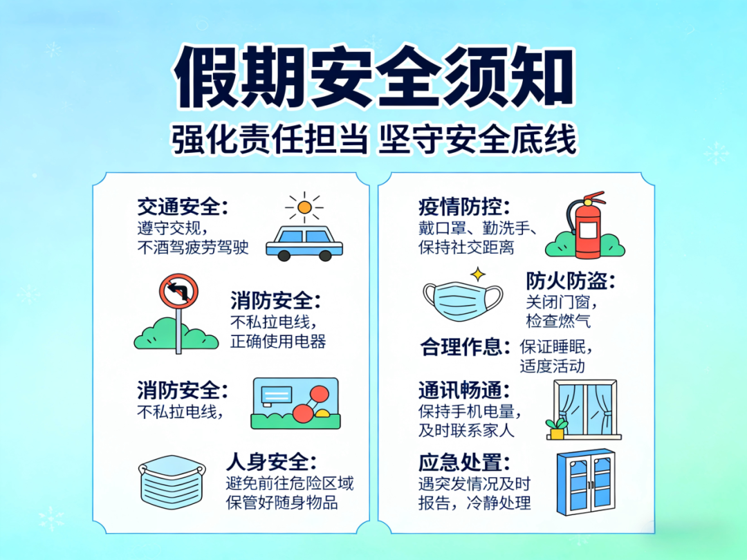 假期出行注意交通安全、消防安全、人身安全,做好疫情防控、防火防盗等工作;合理安排作息,保持通讯畅通,遇有突发情况及时报告、妥善处置,确保假期安全稳定。